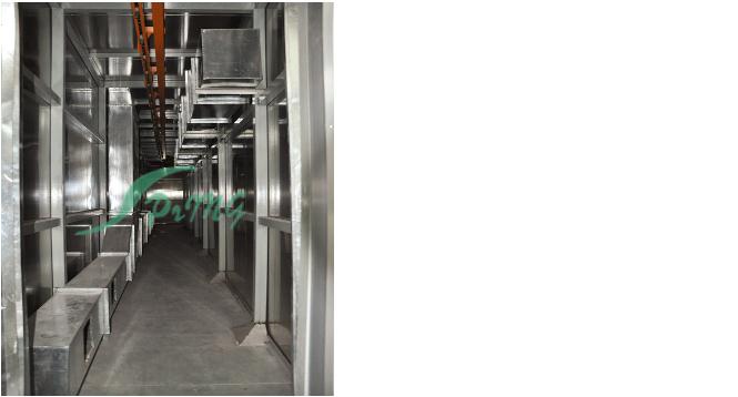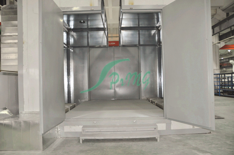 烘烤房又稱烘干固化房 針對(duì)大型電氣、電機(jī)、涂料、化學(xué)用品、外表進(jìn)行固化、食品及各類產(chǎn)品的水分烘干 先進(jìn)的熱風(fēng)循環(huán)系統(tǒng)使工作室溫度分布均勻。低噪聲風(fēng)機(jī)系統(tǒng)創(chuàng)造了安靜的工作環(huán)境。密封電熱管加熱,性能穩(wěn)定,壽命長(zhǎng)。底部裝有軌道并配有供裝載工件或試件 的臺(tái)車,工作效率高。進(jìn)、排氣裝置,可調(diào)節(jié)工作室的換氣量。獨(dú)立控制臺(tái),即可就近控制,也可集中到控制室統(tǒng)一控制?蛇x用進(jìn)口高精度智能程序控溫儀表控 溫,P.I.D參數(shù)自調(diào)整,固態(tài)繼電器調(diào)功,可預(yù)設(shè)多段程序控溫曲線。智能控溫儀表控溫,控制靈敏可靠。記錄儀記錄工作全過(guò)程溫度曲線。超溫保護(hù)裝置能發(fā) 出聲光報(bào)警信號(hào)并切斷加熱電源,保護(hù)設(shè)備及工件的安全。